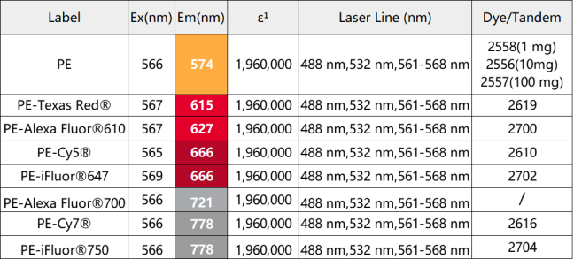 表1.適合多色流式分析使用的PE串聯(lián)染料