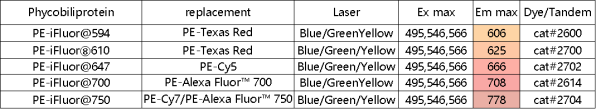 表3.AAT獨有的PE-iFluor系列串聯(lián)染料可以完美替代PE-Cy5,PE-Cy7,PE-AF 700,PE-Texas Red
