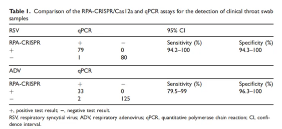 從急性呼吸道感染的兒童中采集咽拭子樣本160例。同時(shí)使用MIRA-CRISPR方法、qPCR方法進(jìn)行檢測,并將結果與臨床試驗結果進(jìn)行比較。與qPCR方法相比,MIRA-CRISPR方法對RSV和ADV的敏感性分別為98.1%和91.4%,檢測特異性均為100%。Kappa值大于0.95,表明其一致性程度較高。