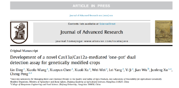 文章標題:《Development of a novel Cas13a/Cas12a-mediated “one-pot”dual detection assay for genetically modified crops》