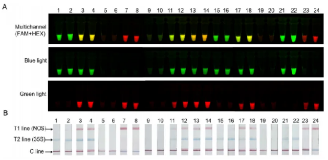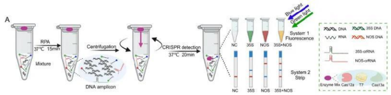 在本研究中,課題組開(kāi)發(fā)了一種新的一鍋法反應——雙重MIRA檢測結合雙重CRISPR(MR-DCA方法),用于同時(shí)檢測轉基因作物中的CaMV35S和NOS遺傳靶點(diǎn),為轉基因作物的檢測提供了一種簡(jiǎn)單高效的方法。