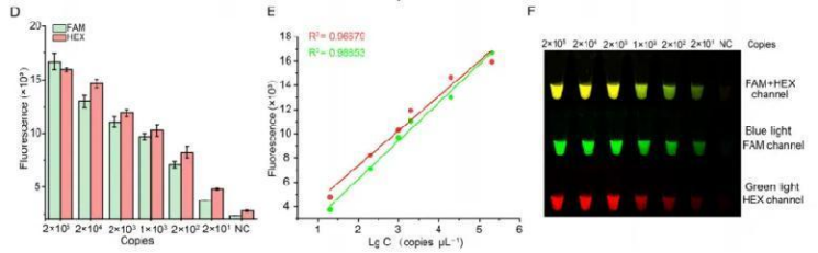 將雙重MIRA產(chǎn)物用雙Cas13a、Cas12a系統進(jìn)行分析,產(chǎn)生兩個(gè)互不干擾的獨立信號,再通過(guò)照明儀器讀取熒光顏色,或通過(guò)帶有兩條T線(xiàn)的試紙條,以實(shí)現雙通道讀出。整個(gè)過(guò)程在不到35min的時(shí)間內完成,檢測限低至20個(gè)拷貝。