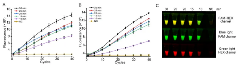 反應時(shí)間是現場(chǎng)檢測的一個(gè)重要因素,課題組觀(guān)察到在反應時(shí)間為10 min時(shí),就已經(jīng)能用熒光儀檢測到FAM和HEX的熒光信號。MIRA結合CRISPR反應,也在15min后觀(guān)察到黃色熒光。