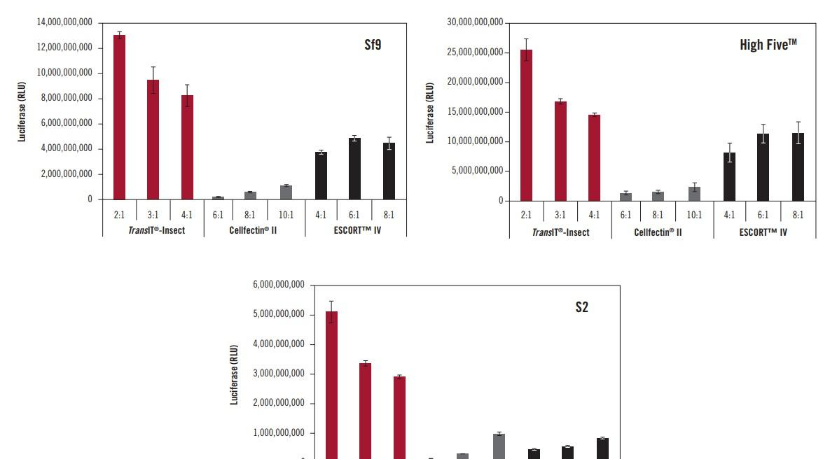 圖2. TransIT®-Insect的性能優(yōu)于競爭對手的轉染試劑。昆蟲(chóng)細胞系(A)Sf9,(B)High Five™, 和(C)果蠅S2細胞,在96孔板中用0.1µg由hr5增強子/IE1啟動(dòng)子驅動(dòng)的熒光素酶表達質(zhì)粒進(jìn)行轉染,使用指定試劑以指定試劑與DNA的比例(µl:µg)轉染。在轉染后48小時(shí)測量螢光素酶的表達。Sf9和High Five™在無(wú)血