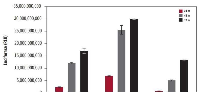 圖4. 使用TransIT®-Insect高效表達蛋白。昆蟲(chóng)細胞系(A) Sf9,(B) High Five™和(C)果蠅S2在96孔板中轉染 0.1 ug的熒光素酶表達質(zhì)粒,轉染試劑與質(zhì)粒的比例為2:1。在轉染后24、48和72小時(shí)三個(gè)時(shí)間點(diǎn)檢測熒光素酶的表達。Sf9和High Five™細胞在無(wú)血清培養基中培養和轉染;S2細胞置于含血清的培養基中。