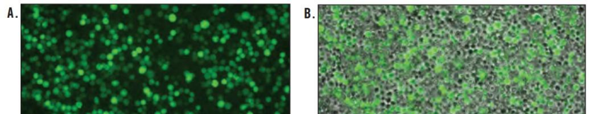 圖1. 使用TransIT®-Insect高效轉染桿狀病毒基因組DNA。6孔板里進(jìn)行轉染,每孔5 x 105 Sf9細胞,質(zhì)粒和轉染試劑比例1:3,使用0.5ug表達GFP的ProGreen™桿狀病毒表達載體(AB Vector)和0.1 µg的pVL1393 轉移載體(AB Vector). (A)轉染后6天使用Zeiss S100熒光顯微鏡拍攝熒光和相位對比圖像。(B) Merge。